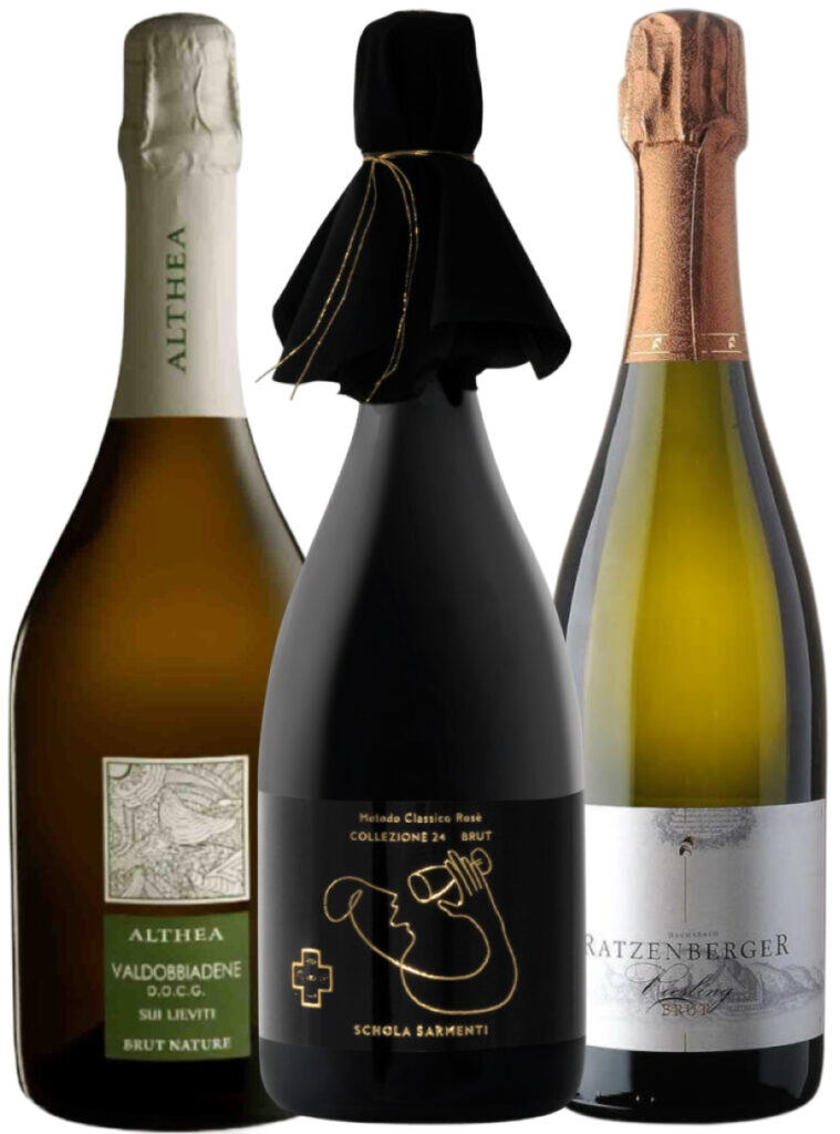 These wines were selected because together they show three very different paths to sparkling quality. Schola Sarmenti Collezione 24 represents the sun-ripened, rosé-coloured and more gastronomic side, made with classic bottle fermentation from negroamaro. Althea Prosecco Superiore Brut Nature Sui Lieviti brings a more origin-driven and rustic expression, where the secondary fermentation takes place in bottle and the wine remains on the lees without disgorgement. Ratzenberger Bacharacher Riesling Sekt Brut gives the package its coolest and most mineral profile, with the precision of riesling and almost four years on the lees. Together, they create a package that feels unexpected, thoughtful and genuinely fun to open.