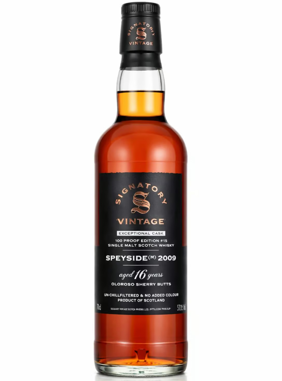 Speyside (M) 16Y Exceptional Cask 100 Proof Edition Signatory is a powerful and deeply sherried single malt from Speyside, bottled by Signatory Vintage as part of their Exceptional Cask 100 Proof series. Distilled in 2009, matured for 16 years and bottled in 2025 at 57.1%, it delivers a concentrated and confident profile with oloroso sherry casks at the forefront. Maturation in oloroso sherry butts gives the whisky generous depth, with clear notes of raisins, dried dates, orange peel, dark chocolate, spice and oak, while the distillate carries the cask influence with both weight and elegance. Bottled without chill filtration and with no added colour, it retains texture, intensity and a more natural character.