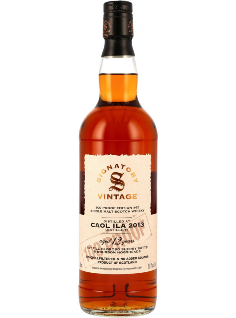 Caol Ila 12 Years 2013/2025 100 Proof Edition #65 is a smoky, coastal Islay single malt bottled by Signatory Vintage in their 100 Proof range. Distilled in 2013 and matured in a combination of first fill Oloroso sherry butts and bourbon hogsheads, it was bottled in 2025 at 57.1% ABV, with no chill-filtration and no added colour. The result is a powerful yet clean and precise Caol Ila, combining peat smoke, fruit and a distinctly maritime character.