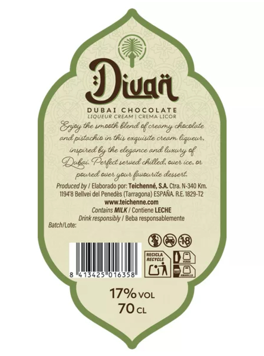 About the producer Divan Dubai Chocolate Liqueur is produced by Teichenné, a family-owned spirits and liqueur producer in Catalonia (Spain). Founded in 1956, Teichenné is known for a broad portfolio of liqueurs and cream liqueurs, with a focus on clear flavours, clean aromatics, and a smooth, well-crafted texture.