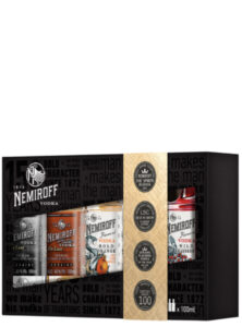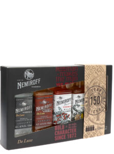This elegant gift set features five miniature bottles (10 cl each) showcasing different expressions of Nemiroff – a perfect way to explore the brand’s range or to give as a refined gift. The selection may vary, but it typically includes well-known editions such as Nemiroff De Luxe, Nemiroff Original, Honey Pepper, Birch Special, and Cranberry.