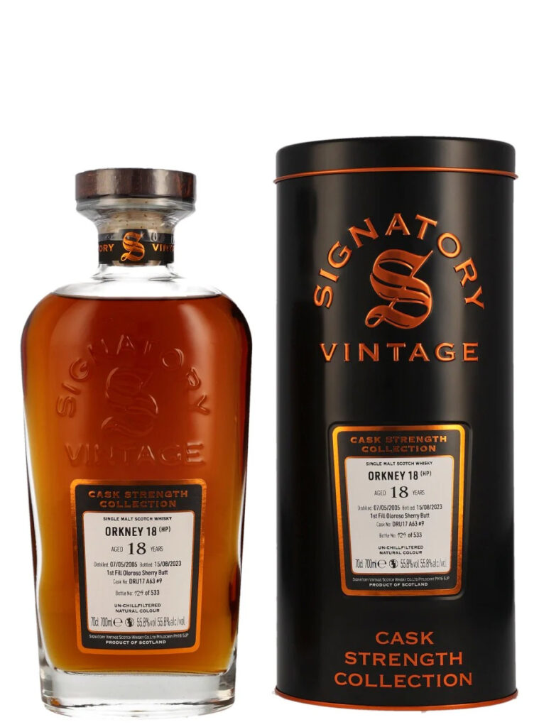Orkney 18 Years (HP) Signatory is a powerful, sherry-heavy island single malt from a “secret” distillery on Orkney – most likely Highland Park. The whisky has been matured for 18 years in a single first fill Oloroso sherry butt and bottled at natural cask strength, without chill filtration and with no added colour. This gives an extremely concentrated character, showcasing both the sherry cask and the classic Orkney style with gentle peat smoke and heather notes.