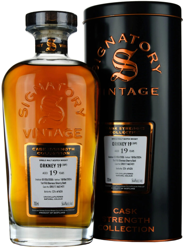 Orkney 19 Years 2005/2024 54.4% is a powerful, sherry-soaked Orkney single malt, bottled by Signatory as part of its Cask Strength Collection. Distilled in 2005 and matured for 19 years in a single first-fill Oloroso sherry butt before being bottled in 2024 at natural cask strength 54.4%, it’s one of those “Secret Orkney” bottlings where the “HP” on the label gives a pretty strong hint about the distillery.