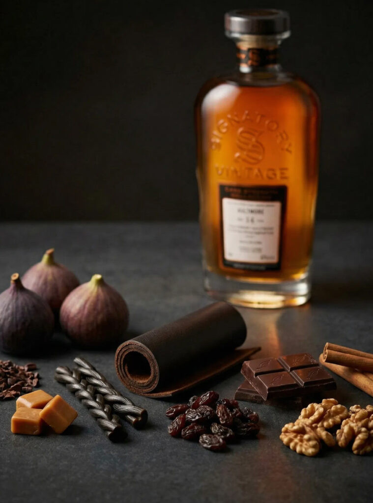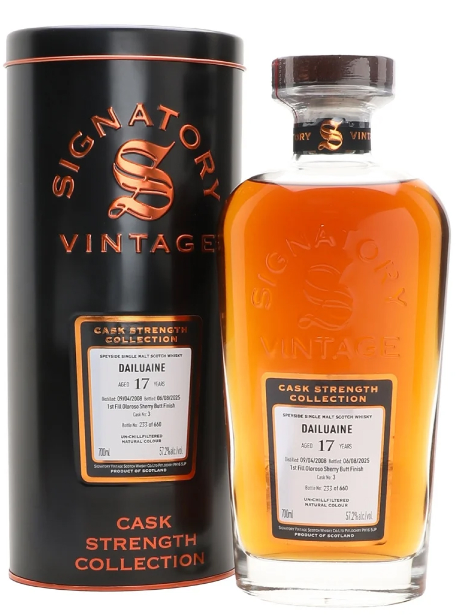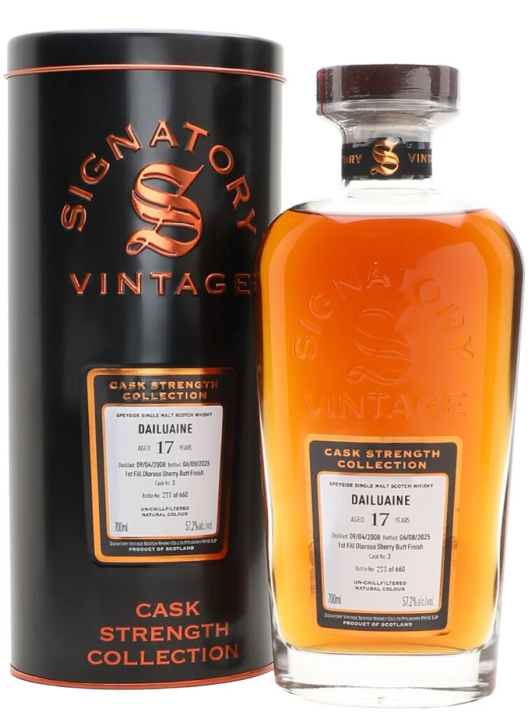Dailuaine 2008 17 Years 57.2% presents itself as a powerful and distinctly sherry-driven single malt from Speyside, bottled by Signatory Vintage as part of their Cask Strength Collection. Distilled in 2008, matured for 17 years and bottled at 57.2%, it was matured in a first-fill oloroso sherry butt, creating a rich and concentrated profile in which dark chocolate, dried fruit, nuts and spiced oak meet Dailuaine’s full-bodied distillate. The result is a whisky of notable weight and depth, where the sherry cask influence adds both sweetness and structure without overwhelming the whole, and the finish is long, warming and generously flavourful.