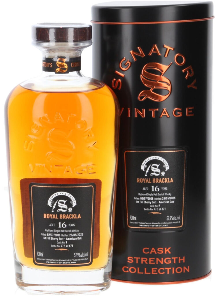 Royal Brackla 16 Years – Symington’s Choice – Signatory Vintage 57.9% is a richly sherried Highland single malt, bottled as a single cask in the Cask Strength Collection and personally selected by Andrew Symington. Distilled in 2008 and matured for 16 years in a first-fill Oloroso sherry butt made from American oak (cask no. 9), it was bottled in 2025 at its natural cask strength, yielding just 671 bottles.