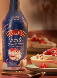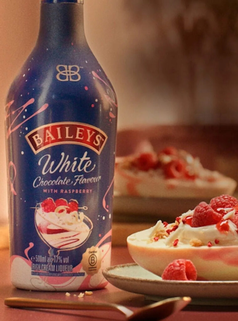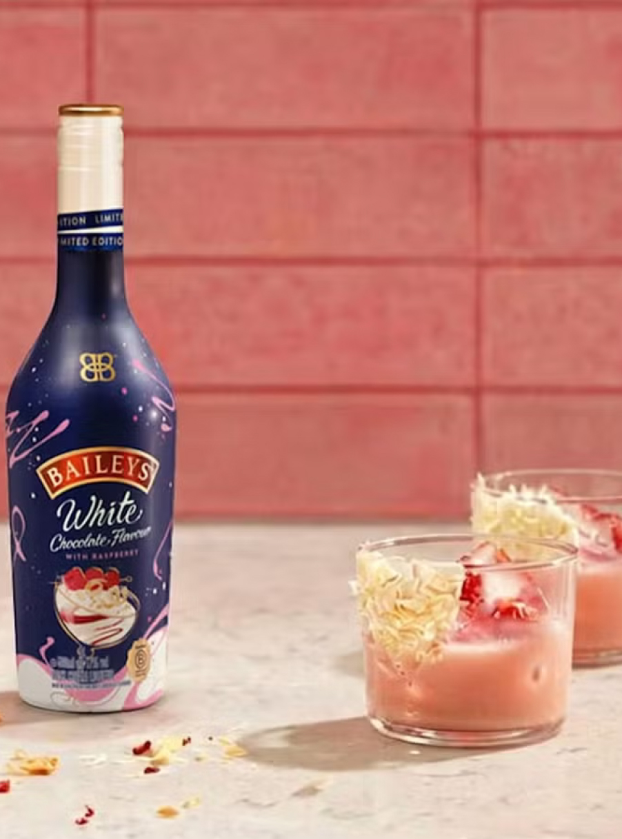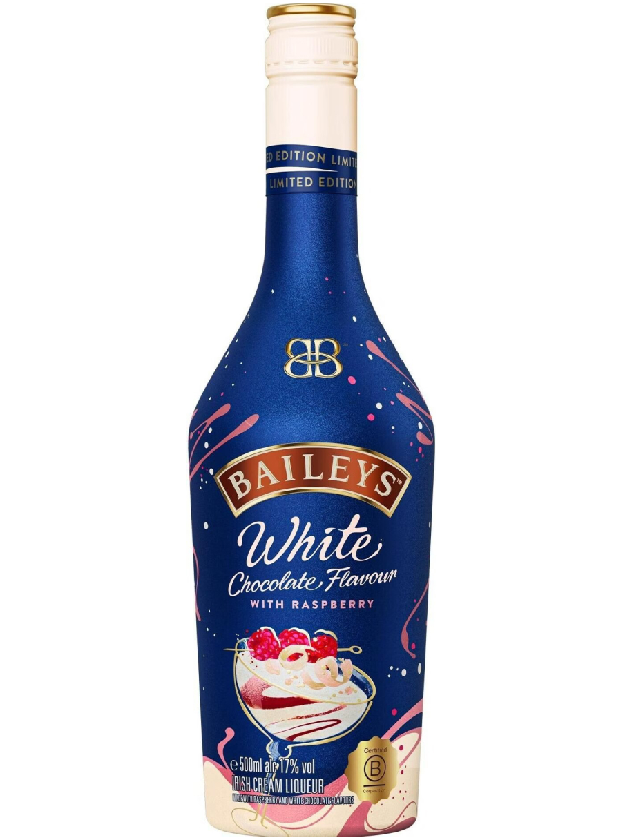 Baileys White Chocolate & Raspberry er en smagssat irsk flødelikør, der bygger videre på Baileys’ klassiske stil, men med en tydeligere dessertprofil. Her mødes Baileys Irish Cream af smagen af hvid chokolade og den sødligt syrlige tone af hindbær, hvilket giver et blødt, cremet og udpræget indulgent udtryk. Produktet har en alkoholprocent på 17 %, indeholder mælk/laktose, og Baileys som brand produceres og tappes eksklusivt i Irland.