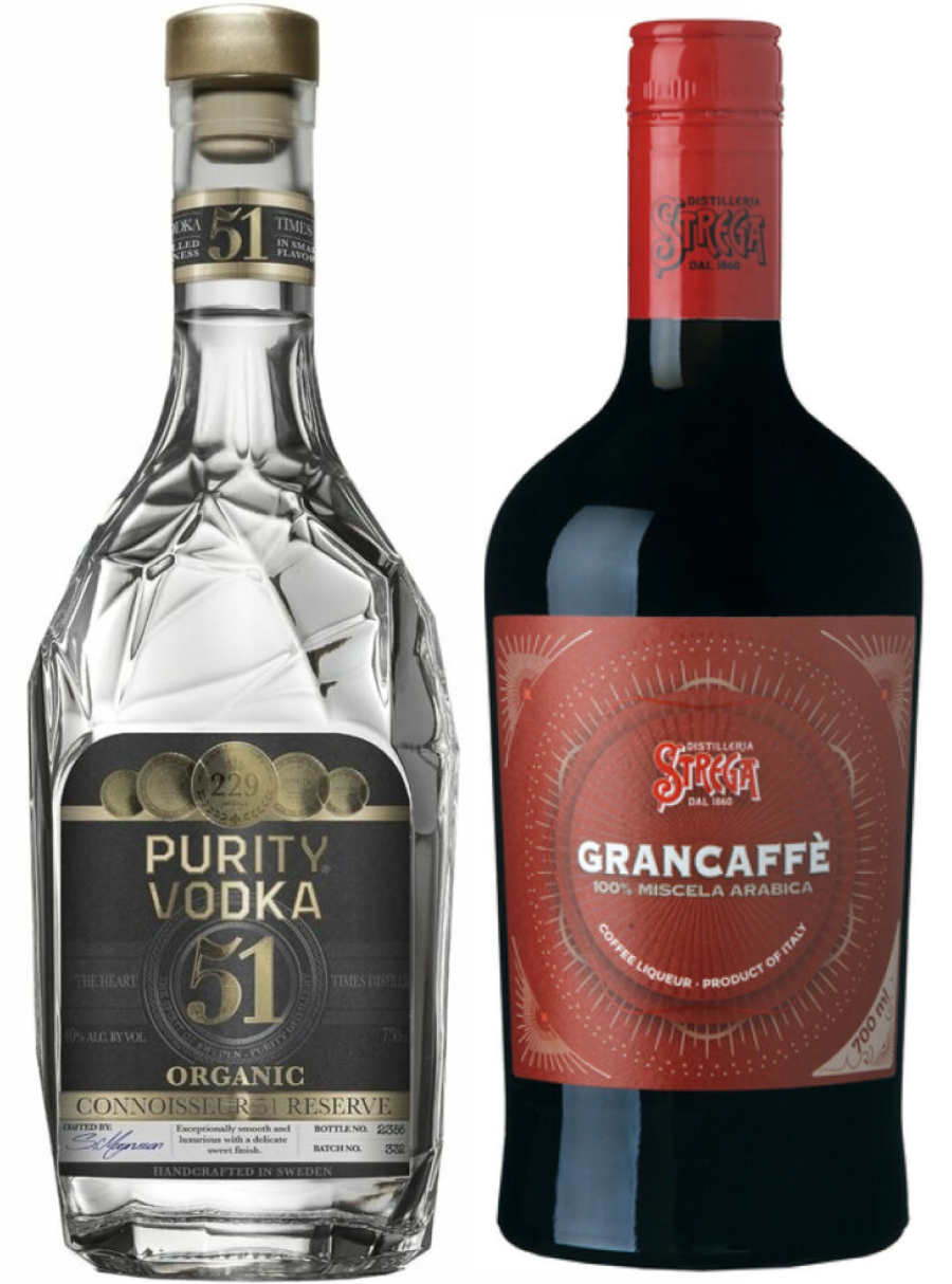 Her får du et sæt til dig, der vil lave en Black Russian i absolut højeste kvalitet. Purity Vodka 51 er en svensk premium-vodka med fokus på maksimal renhed og en silkeblød mundfornemmelse – perfekt som krystalklar base i cocktails. Til det får du Strega GranCaffè, en intens kaffelikør med tydelig espresso-karakter, mørk dybde og en afrundet sødme, der samler drinken.