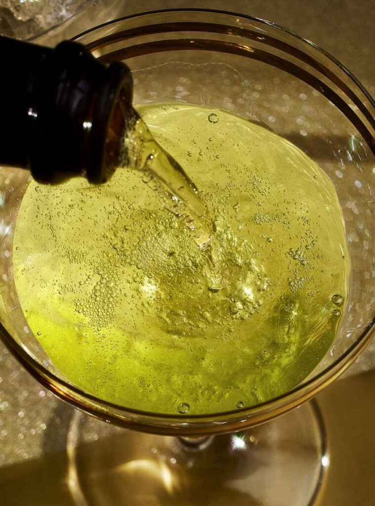 Top langsomt op med iskold champagne, til drinken bliver let mælket/opalescent.