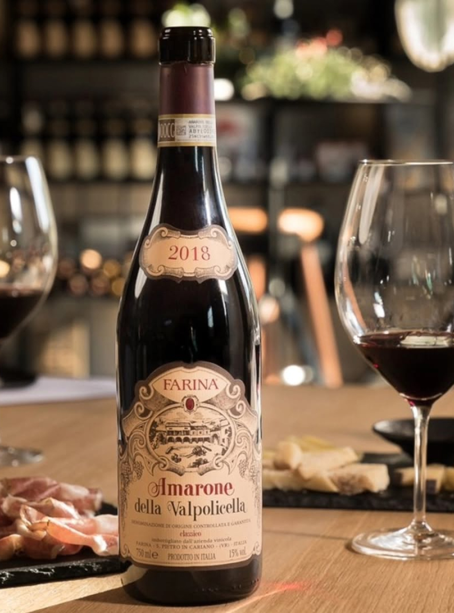 I glasset står Farina Amarone ofte mørk rubinrød med tæt kerne. Duften er typisk generøs og nuanceret med tørrede kirsebær, blommer og rosiner, efterfulgt af kakao/mørk chokolade, vanilje, kanel/nelike, og indimellem et diskret strejf af tobak, læder eller ristede nødder. Smagen er fyldig og rund med tydelig frugtkoncentration, bløde men tilstedeværende tanniner og en lang eftersmag, hvor krydderier og en let “ristet” tone hænger ved. Trods vinens kraft er der ofte en fin friskhed, som giver balance og gør den mindre tung.