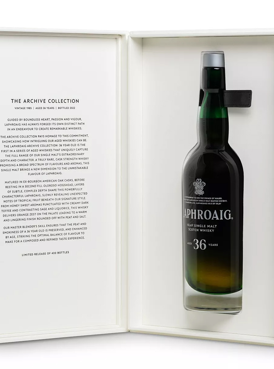 The Archive Collection 36 Year Old tager dig med på en årtier-lang rejse gennem smag. Dette er den første udgivelse i en ny serie af stærkt begrænsede, lagrede whiskyer. Hver flaske er håndblæst og inspireret af det grønne havglas, man finder på Islays strande.
