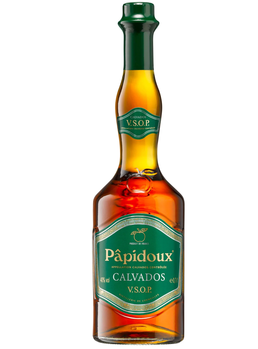 Papidoux Calvados VSOP er en klassisk calvados fra Normandiet i det nordvestlige Frankrig – altså en æblebrandy lavet på cider, som destilleres og derefter lagres på egetræsfade for at opnå dybde, rundhed og et tydeligt fadkrydret udtryk. Papidoux er et velkendt navn inden for calvados, og stilen ligger solidt i den tradition, hvor æblets frugtighed skal stå i centrum, men med tilstrækkelig lagring til at skabe varme, struktur og længde.