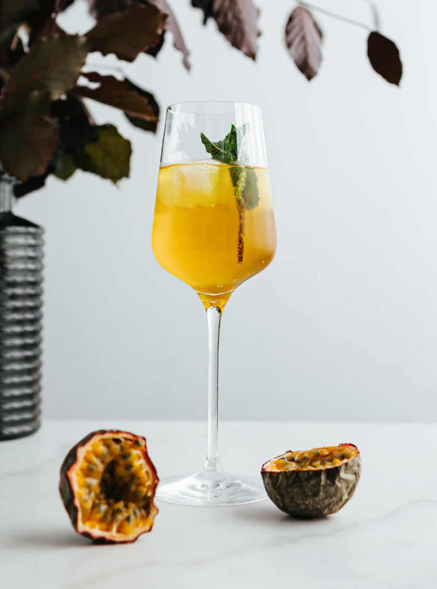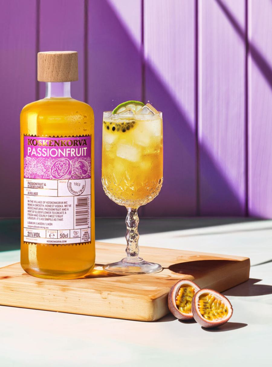 Serveringsidé Byg i et stort glas med masser af is. Tilsæt Koskenkorva Passionfruit, top med prosecco og afslut gerne med et lille skvæt danskvand for ekstra lift. Pynt med lime eller lidt passionsfrugt.