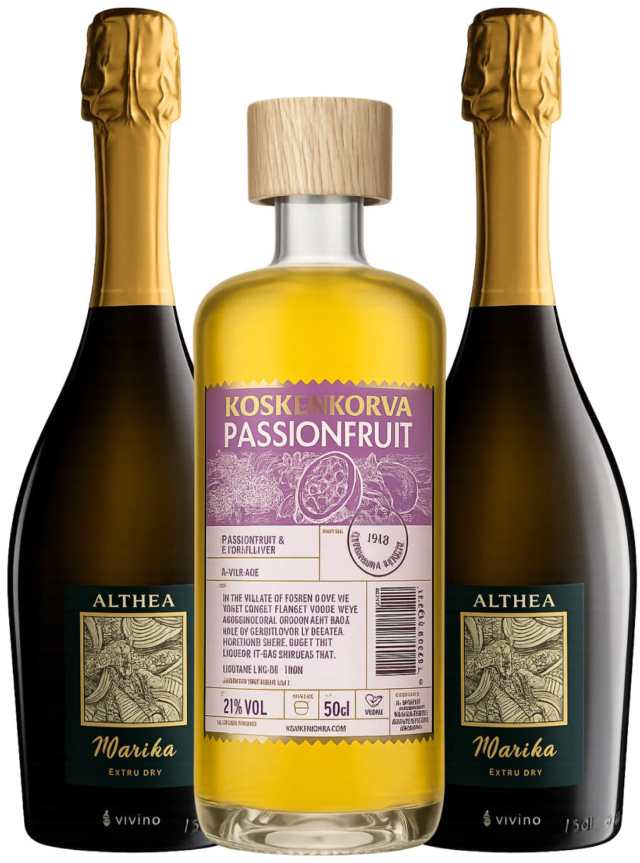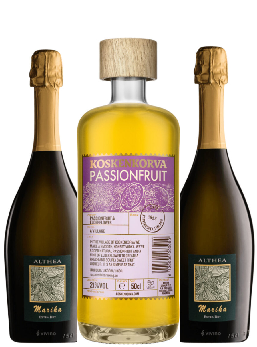 Tropisk, frisk og utrolig nem at servere. I denne pakke får du Koskenkorva Passionfruit sammen med 2 flasker Althea Marika Prosecco Extra Dry – en kombination, der giver en spritz med solmoden passionsfrugt, livlig syre og sprøde bobler, som gør drinken let og forfriskende.