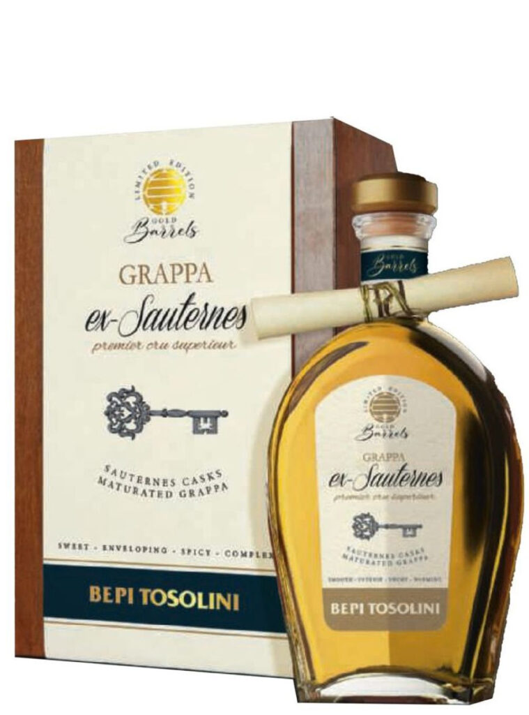 Bepi Tosolini är ett ikoniskt, familjeägt destilleri från Friuli i nordöstra Italien, känt för precision, aromatik och en polerad, elegant stil. Deras barrique-lagrade grappor är särskilt uppskattade eftersom de bevarar druvkaraktären men adderar ett extra lager finess genom noga utvalda fat – och här ger Sauternes en tydligt “gyllene” signatur.