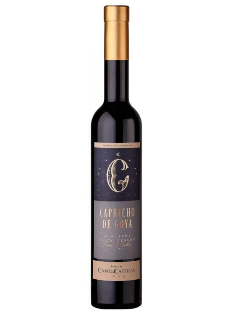 Capricho de Goya Moscatel produceras av Bodegas Camilo Castilla, den äldsta producenten i Navarra distriktet. För över 100 år sedan planterades den kalkhaltiga lerjorden med moscatel de gran menudo, vilket är identiskt med muscat blanc á petit-korn, den bästa muscatsorten. Druvorna från dessa forntida vinstockar ger extremt låga avkastningar – magra 1500 kg / hektar! – och ger idag detta unika söta vin, som måste gå igenom så mycket innan det tappas på flaska!