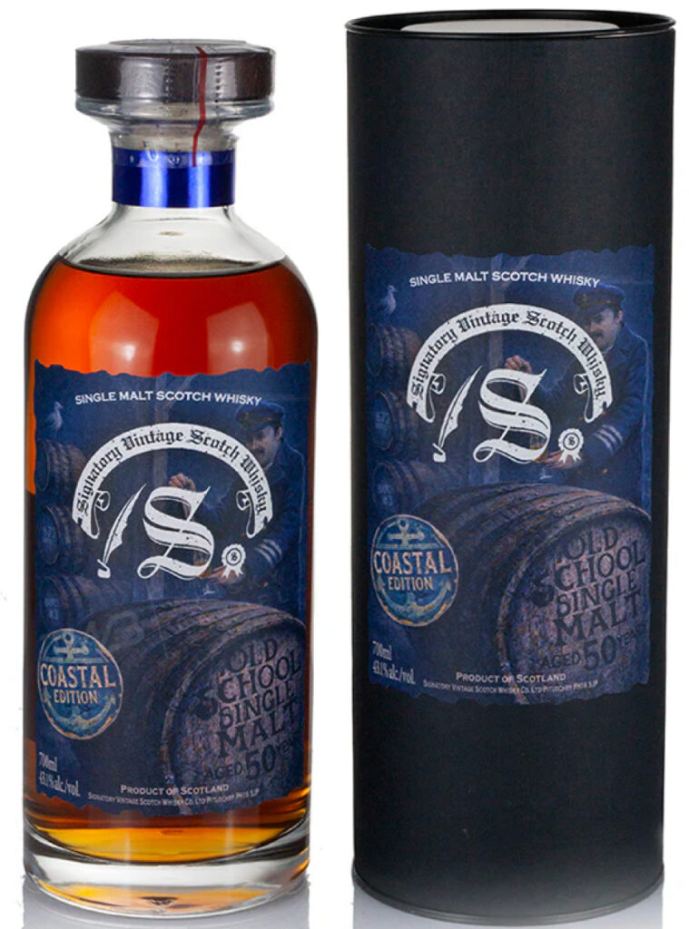 Old School Malts 50 Year Old – Coastal Edition, buteljerad av Signatory Vintage, är en extraordinär single malt Scotch whisky som har lagrats i ett halvt sekel på ett Oloroso sherry butt. Denna vördnadsbjudande utgåva fångar mötet mellan lång fatlagring och en stämningsfull kustkaraktär och levererar en anmärkningsvärd kombination av djup, balans och elegans.