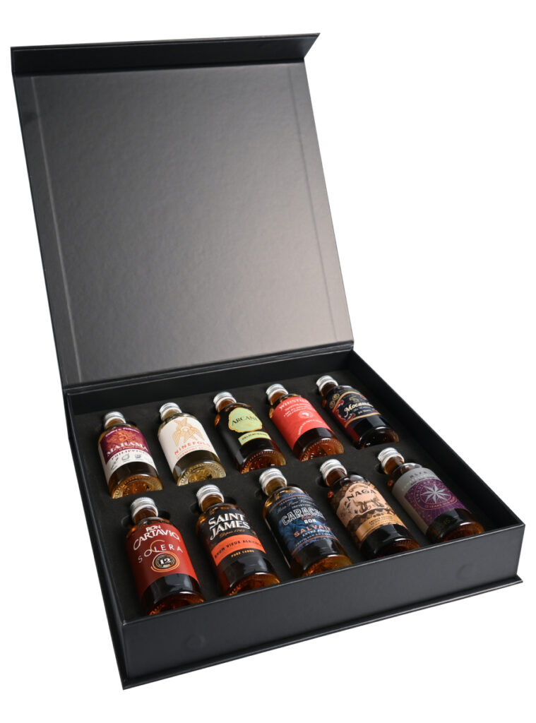 The Rum Box innehåller 10 rom-/spirit drinks från 10 olika länder.